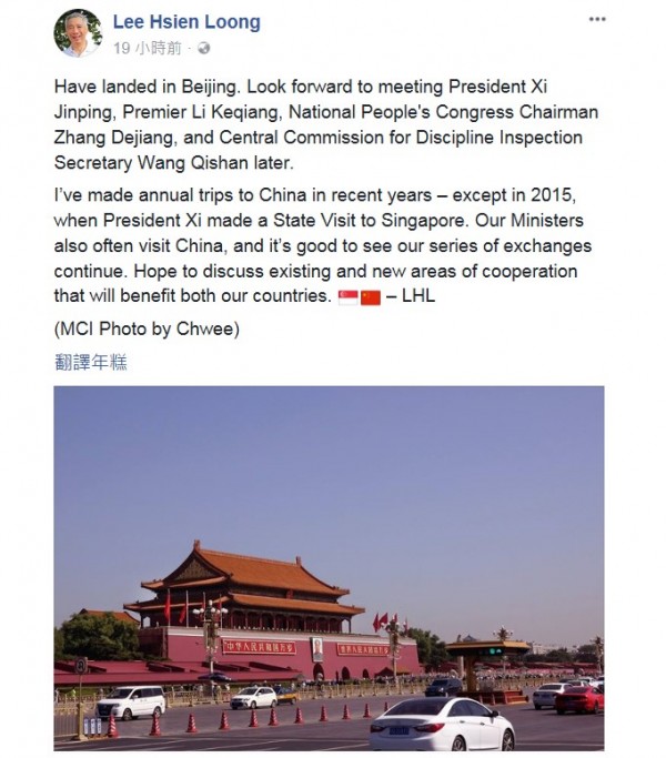 新加坡總理李顯龍19日在其臉書表示已抵達北京,期待著會見中共中央紀律檢查委員會書記王岐山等人。(圖擷取自李顯龍臉書)