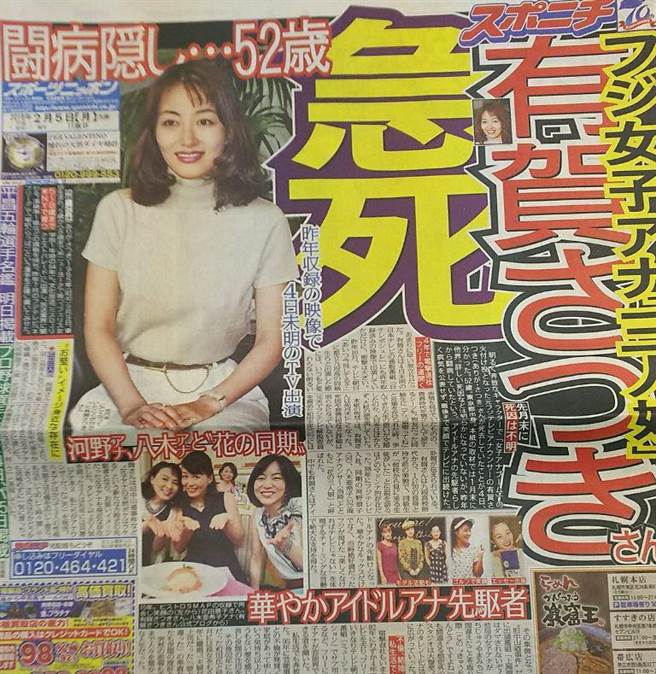 日本媒體大篇幅報導有賀皐月急逝消息。(取材自網路)據《女性SEVEN》周刊報導,前富士電視台主播有賀皐月1月30日因病急逝,2月1日的告別式上僅兩人參加,即她年邁的父親與讀中學的女兒。人氣主播生命最後如此孤單地離世,但這是她本人的堅持。