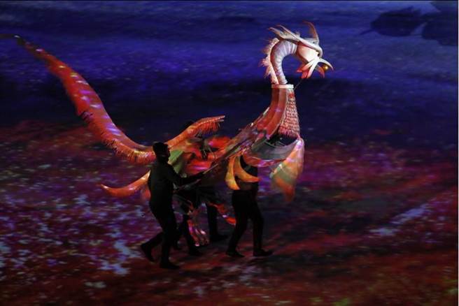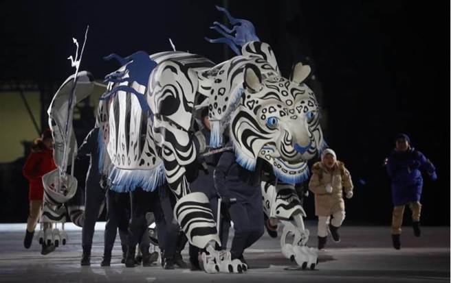 2018年平昌冬奧開幕典禮正式開始,本屆吉祥物白老虎進場表演。(圖/美聯社)
