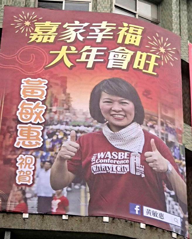 回鍋參選嘉義市長的國民黨參選人黃敏惠,於12日在噴水圓環掛出第1幅大看板,以喜氣的大紅色為基調,選用2011年世界管樂年會的歡樂照片,搭配「嘉家幸福.犬年會旺」的新春賀詞,向市民拜年。