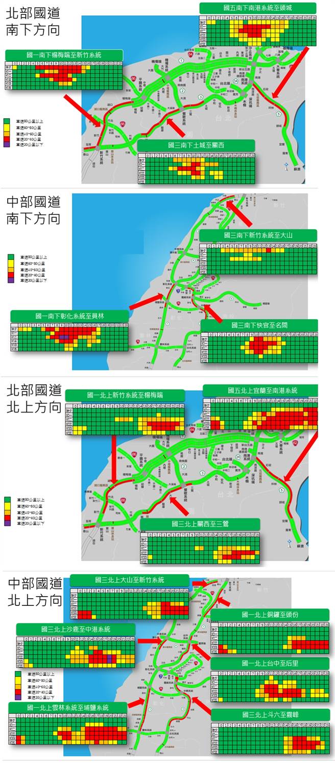 除夕由清晨至下午3點、初一由上午10點至下午3點、初二清晨至中午,以及初三上午9點至中午之車速預估均不到40公里