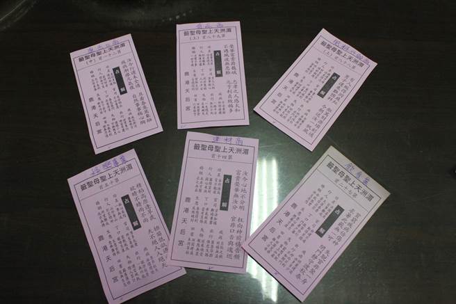 今年抽出最好行業的籤(上排)和較差的籤(下排)。(吳敏菁攝)今年抽到運勢較差有建材商,詩云「富貴榮華無汝分」、飲食業「閉門靜守渡秋冬驕」、娛樂事業「欲晴不晴雨不雨」等,都顯示還待時來運轉。其餘,還有油商、礦業等士農工商,共40多行的籤運,整體的運勢還算不錯。