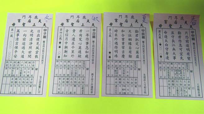 台南市鹿耳門天后宮今年跋出的四季籤。(洪榮志攝)台南市鹿耳門天后宮20日舉行「跋四季籤」活動,預測未來1年的國運及社會流年。經歷時30分鐘擲出的春夏秋冬等4籤,春夏秋屬平籤,冬季是上籤,國運倒吃甘蔗,整體運勢中上。