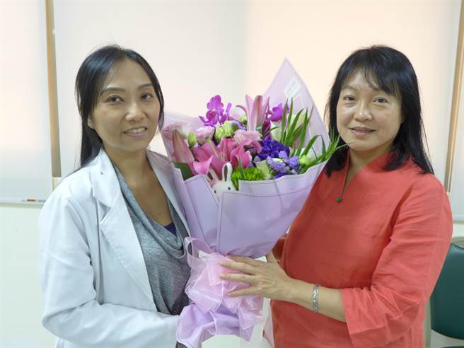 烏日林新醫院乳房外科醫師吳玉婷(左起)送花給黃姓女導遊,祝賀她順利控制癌症。(林欣儀攝)乳房不痛就沒有問題?住在台南、53歲的黃小姐,4年前洗澡時發現胸部會移動的硬塊,她以為是肌肉、不以為意,之後為安心、在友人建議下到醫院檢查,卻意外檢出乳癌第二期,所幸經手術切除腫瘤,並佐以放療、化療及賀爾蒙療法,目前控制良好。