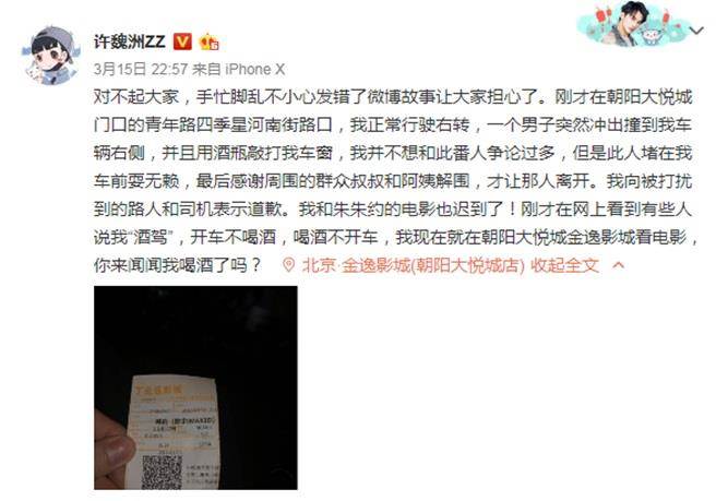 對於微博瘋傳酒後駕駛,許魏洲也發文澄清,表示自己正在某影城看電影,不信的人可以到現場聞聞是否有酒臭味,還秀出影城票根佐證,最後不忘強調「開車不喝酒,喝酒不開車」。