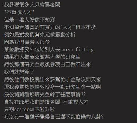 該名工程師在PTT貼文,日前替某電器商做震動分析,因為人手不足,在別人引薦之下,找來「公館某大學」研究生幫忙做數據分析,出6萬元要求在兩個星期內完成,但該名研究生後來發現自己無法完成案子,所幸教授跳出來幫忙,才沒有讓案子開天窗。因此工程師支付薪水時,給教授的酬勞比研究生多,卻引起研究生不滿,在臉書罵「慣老闆、不重視人才」、「只想降低成本!」