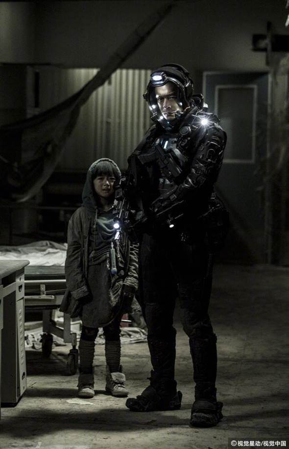 古天樂(右)穿戰鬥機甲守護小女孩。(取自新浪微博@新浪電影)