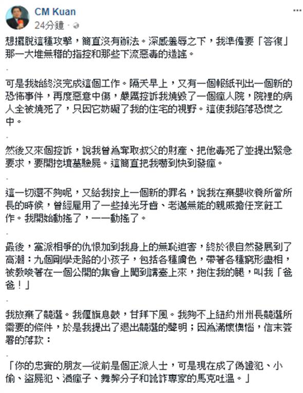 管中閔看到網友的留言馬克吐溫《競選州長》的內容覺得很棒,於是想要借分享PO文。(圖/翻攝自管中閔 臉書)