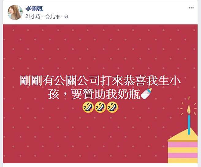 佩甄寫下:「剛剛有公關公司打來恭喜我生小孩,要贊助我奶瓶」,引來好友爆笑,「苦主」老公王祚軒還秒PS一張自己戴著綠帽的照片,虧佩甄「討客兄」,佩甄也回應:「Sorry,我真的不是故意的」,夫妻倆幽默甜蜜互動,可見感情之好。