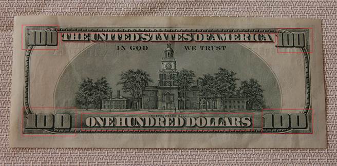 百元美鈔背面的上下兩排英文字母及4個角落「100」數字等印刷是辨識真假的重點。(陳淑芬攝)百元美金假鈔坊間偶有所聞,民眾要如何自我簡單辨識。保安警察第七總隊第一大隊公關張嘉閔表示,坊間美金假鈔最常見的是最高幣值的百元美金,民眾掌握「視覺」及「觸感」訣竅就先初步辨識,近1年半以來,在台灣查扣到的假美鈔,大部分都是舊版大頭版美金居多,且在「100」字樣都還無法做到立體浮凸印刷。