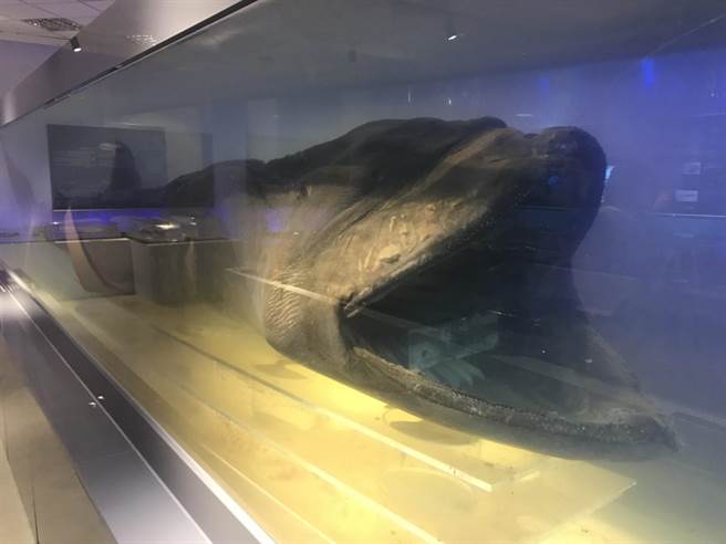 全球不到20尾的罕見巨口鯊標本,被放置在基隆海科館研究典藏中心,身長4.5公尺,張著血盆大口,十分吸睛。(張穎齊攝)