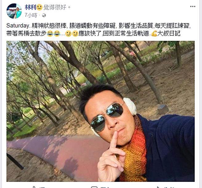 林立洋術後康復順利。(圖/取自林利臉書)51歲男星林立洋(後改名為林利)上月底證實罹患大腸癌二期,今年一月開刀已切除達11公分的腫瘤,近日忙復健的他,今(10日)在臉書報平安,說除了目前除了腸道蠕動還不順利外,其他一切都好,他每天都練習提肛,並帶馬桶健走曬太陽,相信很快就能正常生活。