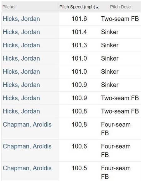 不過今年春訓的時候就有人發現,速球榜上的名字似乎換人了,一個叫做希克斯(Jordan Hicks)的名字包辦了例行賽開季最快的幾顆球,把查普曼擠到了第2名。