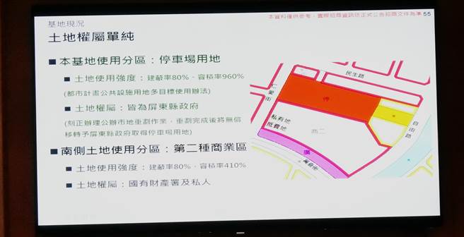 屏東市舊酒場停車場BOT案具交通、人潮聚集、基地方正,且權屬單純等開發優勢,可做為零售、餐飲、娛樂及旅館等使用。(盧金足攝)屏東縣長潘孟安16日帶隊到台中為屏東舊酒廠及第2路外停車場BOT招商,為吸引投資釋出大利多,中北部投資飽和,希望有外溢效果,從蛋黃區外溢到蛋白區,該BOT案占地3000多坪,可規畫停車場、旅館及商場等複合式經營,潘孟安向中部廠商招手「投資屏東正對時!」