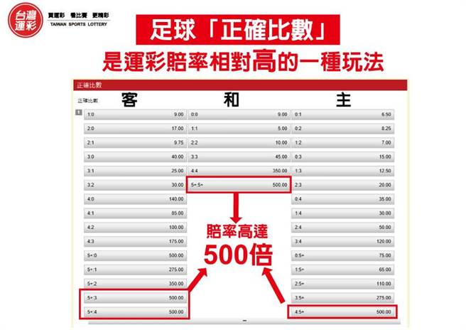足球「正確比數」是運彩賠率相對高的一種玩法。(圖/台灣運彩提供)足球「正確比數」是運彩賠率相對高的一種玩法,少則5、6倍,多則高達500倍,場場都可以「單場」投注,如果再加買「串關」投注,高賠率連續相乘的結果,賠率就可以高達千倍或萬倍,如果中獎,獎金往往都相當可觀,廣受喜歡以小博大的彩迷定期定額購買,大家不妨可以試試,或許你也可以跟那位幸運彩迷一樣,開心抱回大獎。