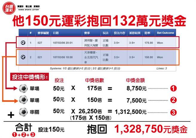 投注150元,抱回132萬元獎金。(圖/台灣運彩提供)