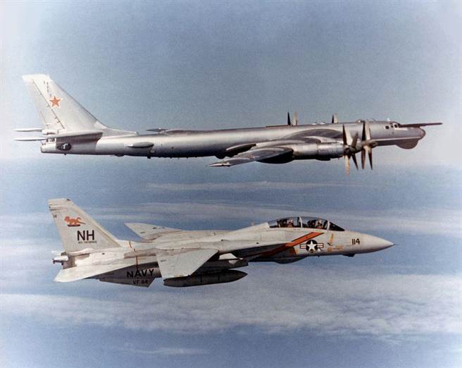 冷戰期間經常出現的畫面,美軍的F-14戰機(圖下)和蘇聯的圖95轟炸機(圖上)並肩飛行。(圖/美國海軍)在伊朗爆發伊斯蘭革命前,統治者巴勒維國王(Mohammad Reza Pahlavi)於1970年,向當時到訪的美國總統尼克森(Richard Nixon)提出需求,希望能購買新型戰機,藉此對抗蘇聯(USSR)的米格25戰機(MiG-25)。當時的伊朗擁有兩個選擇:F-14「雄貓」戰機或是F-15鷹式戰機(McDonnell Douglas F-15 Eagle)。最終雄貓勝出,皇家空軍採購了80架F-14A型戰機和700多枚AIM-54鳳凰飛彈。