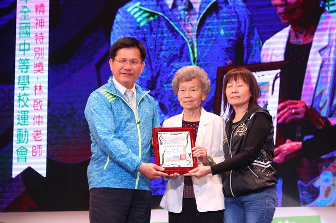 林佳龍頒發特別獎給已故后綜高中田徑教練林啟仲,由其母親及姐姐代表受獎。(陳世宗攝)