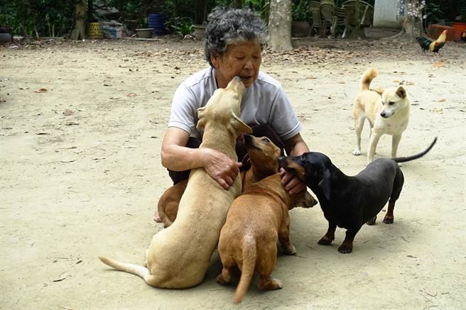 張高寶月當5隻狗的狗班長生活很快樂滿足,每一隻都很愛她。(周麗蘭攝)古坑鄉荷苞山旁的竽芯園樹屋咖啡旁,常見一名穿雨鞋、袖套、帶鐮刀的阿嬤下田,身邊有5個保鑣護送,他們分別是3隻臘腸狗、1隻米克斯、1隻秋田犬。隊長82歲張高寶月被簇擁著下田,一行6「人」都很快樂!