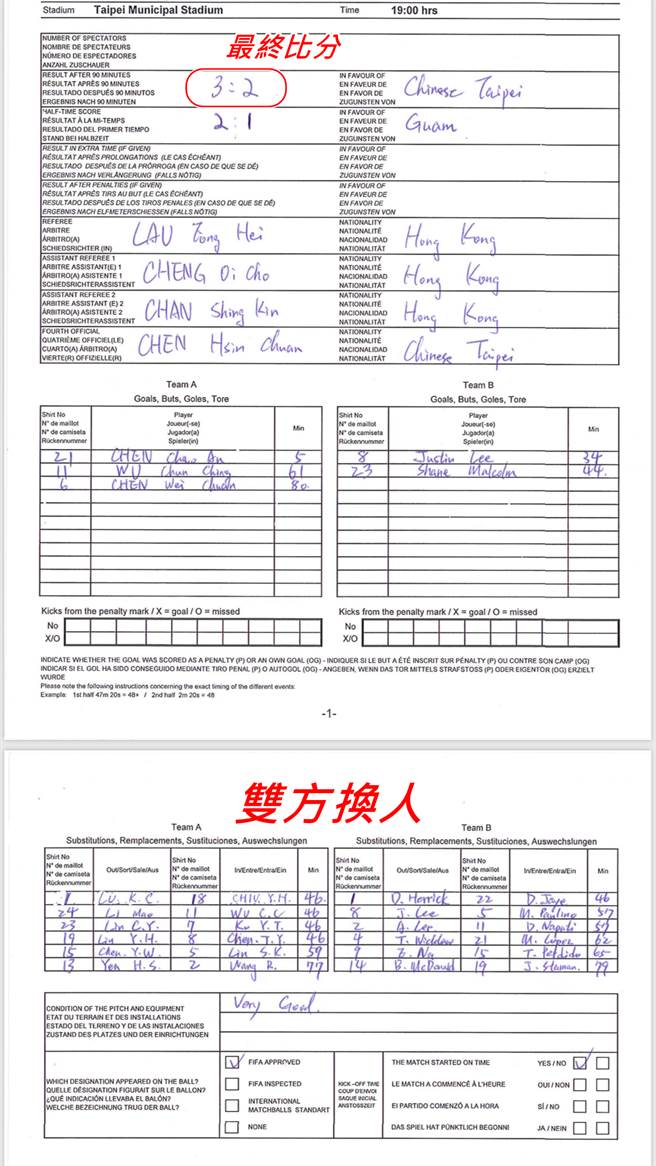 中華足協提出2016年與關島友誼賽的比賽報告,證明呈報的比數就是3比2。只是該役雙方都換了10名球員,紀錄上卻僅各6人。(中華足協提供)事實上,這場2016年3月19日在台北田徑場舉行的友誼賽,程序上的確有瑕疵,只是並非週刊所指控的「造假比分」,而是「換人次數登錄不實」。當時兩隊各換了10名球員,超過正式國際友誼賽的6人限制,但呈報的比賽報告僅記錄各換6人。FIFA也在調查之後,於該年6月取消是役換算的世界排名積分。