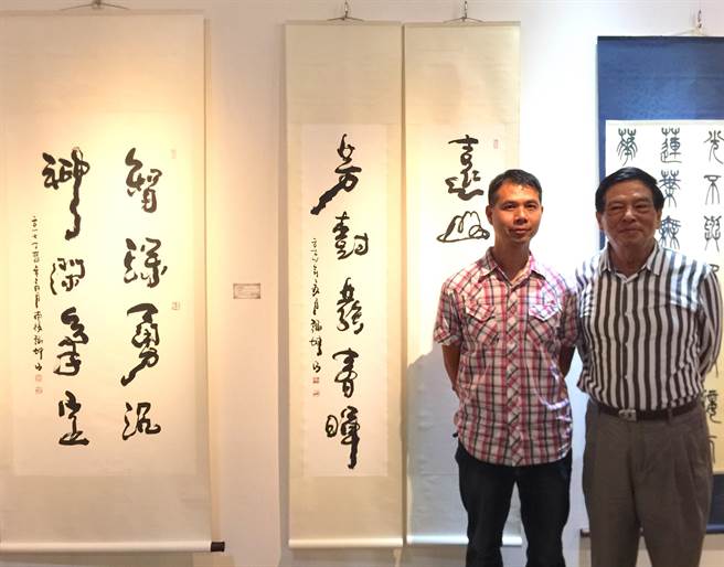 書法家謝坤山(右)捐贈書法作品義賣,獲收藏家青睞。(廖志晃攝)