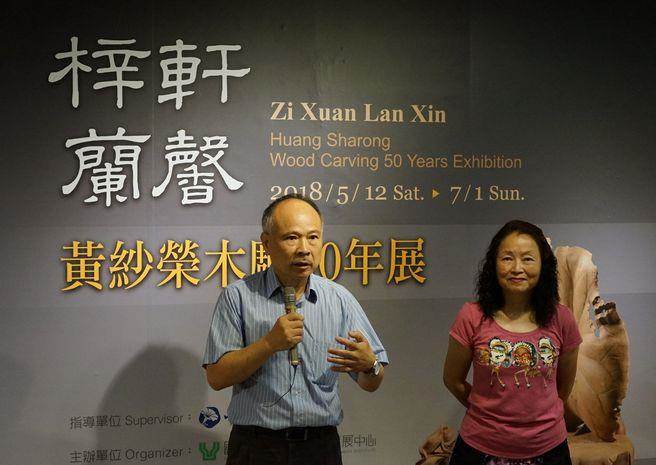 參展工藝家黃紗榮賢伉儷開幕致詞。(台北當代工藝設計分館提供)「梓軒蘭馨-黃紗榮木雕50年展」
