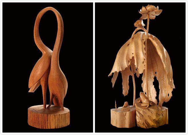 黃紗榮〈你儂我儂〉(左)、黃紗榮〈看破〉(右。)(台北當代工藝設計分館提供)黃紗榮為國立台灣工藝研究發展中心「台灣工藝之家」品牌認證的木藝類工藝師之一,於2011年進駐鹿港桂花巷藝術村,投入木雕創作領域近50年。受邀於彰化縣文化局和各地藝文館所辦理個展,其作品參與國內競賽亦頗受好評,先後於1998、1999和2002年分別獲得台灣區木雕藝術創作比賽、第一屆彰化縣磺溪美展和第十六屆全國美展工藝類首獎的殊榮。