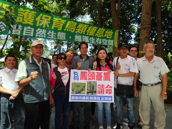 台南市永康區勝利里一處公園預定地發現二級保育鳥類鳳頭蒼鷹身影,目前正值繁殖期,地主近期卻整地欲蓋建物,居民向市議員林燕祝陳情,15日與護樹、環保團體舉辦記者會為鳳頭蒼鷹請命。(莊曜聰攝)