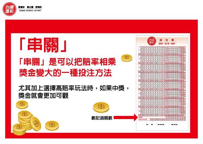 串關玩法解說。(台灣運彩提供)台中潭子的投注站3月18日有位消費者選了4場足球比賽進行「串關」投注,其中3場買「半場/全場」,1場買「正確進球數」,共投注200元串4關,分別是「湘南比馬Vs.FC東京 和/主」賠率4.0倍、「仙台維加塔Vs.清水心跳 主/和」賠率13.0倍、「柏雷索爾Vs.大阪飛腳 客/和」賠率14.0倍、「大阪櫻花Vs.神戶勝利船 2球」賠率3.2倍,比賽結果(上半場/全場)依序為「0:0/0:1」(和/主)、「0:1/1:1」(主/和)、「2:1/2:2」(客/和)、「0:1/0:2」(2球),4場結果完全命中,串4關中獎,賠率連續相乘的結果讓他抱回46.5萬元獎金(200元X4.0倍X13.0倍X14.0倍X3.2倍=465,920元),羨煞不少人。