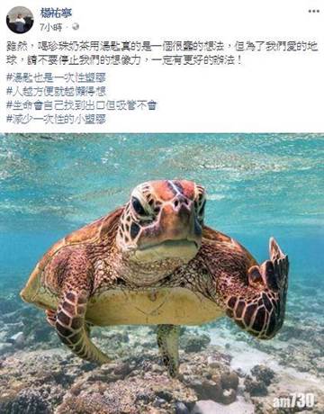 楊祐寧在臉書PO文表示:「雖然,喝珍珠奶茶用湯匙真的是一個很蠢的想法,但為了我們愛的地球,請不要停止我們的想像力,一定有更好的辦法!」並一連下hastag諷「湯匙也是一次性塑膠」、「人越方便就越懶得想」、「生命會自己找到出口但吸管不會」,呼籲大家能減少一次性的小塑膠。