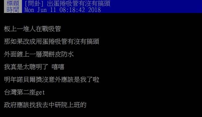 網友推薦改用蛋捲吸管。(翻攝自批踢踢)網友在批踢踢八卦版發文「如果改成用蛋捲吸管有沒有搞頭?外面再鍍上一層潤餅皮防水,明年諾貝爾獎沒意外應該是我了啦」。還有網友在臉書《爆政公社》推薦,用「脆X酥」當作環保吸管,使用完畢還可以吃下肚,泡到飲料裡面還可以增添風味。