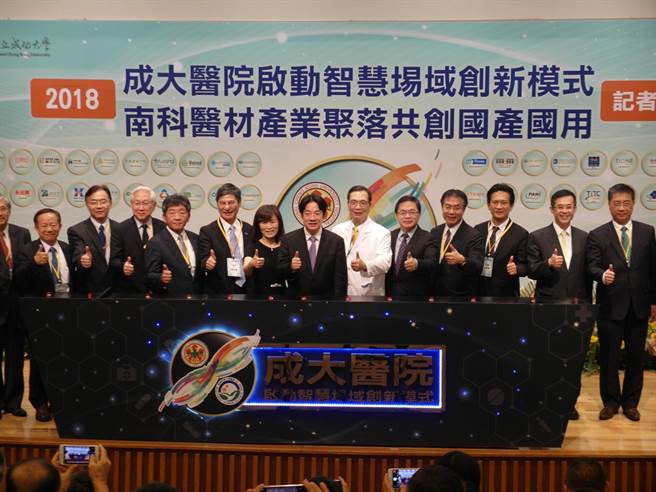成大醫院啟動「醫材產業聚落共創國產國用」政策,宣示產學研醫將攜手提升醫材產業的發展,獲得行政院長賴清德(右七)的肯定。(洪榮志攝)成大醫院12日慶祝30周年院慶,並啟動「醫材產業聚落共創國產國用」儀式,宣示產學研醫將攜手提升醫材產業的發展。成醫出身的行政院長賴清德專程南下祝賀,並肯定成醫與醫材業者合作切入國際領域,台灣的醫療絕對可以走出一條非常不一樣的道路。