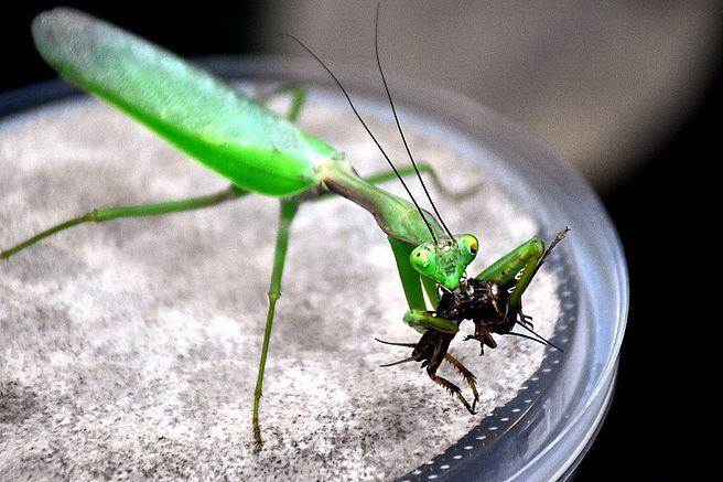 選定的雌、雄螳螂見面前,保育員會先餵些食物給雌螳螂,以免剛碰頭她就把對方當作營養的食物吃了。(台北市立動物園提供)面對像「台灣斧螳」這類大型螳螂的終身大事時,保育員這個「媒人」必須嚴陣以待,因為雌蟲常會為了補充產卵時所需要的蛋白質,在交配時把雄蟲吃掉,所以為了減少螳螂的損傷,保育員必須先做好萬全的準備。