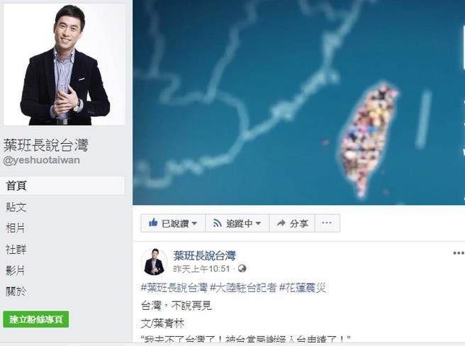 陸記者葉青林在臉書PO文說「台灣,不說再見」。(翻攝「葉班長說台灣」臉書)大陸記者葉青林申請入台受阻,在兩岸新聞圈掀起軒然大波。陸委會表示,不容許陸媒記者以製造假新聞方式,散布不實言論。對於蔡政府因葉青林在報導花蓮震災中,日本搜救隊拒絕進入危險的災區的真相,惱羞成怒而拒絕讓葉青林入境一事,前警大教授葉毓蘭說: 無言!並且今年自由之家評論台灣的自由度時,台灣的言論自由排名必然會因葉青林事件,像我們的競爭力一樣,節節敗退!