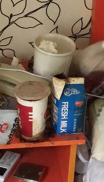 房內堆滿垃圾,連落腳的地方都沒有。(圖/都市快報微信)一張雙人床上,半張床上是方便面盒、吃過的外賣、穿過的衣服和各種空飲料瓶;床頭櫃上,幾個空飲料罐疊放在一起,一個開啟的牛奶盒已經發黑霉變。房間裡瀰漫著一股刺激眼睛的餿臭味,民警周旭走進去的時候禁不住頭皮發麻。