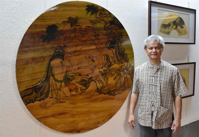 為展現對不同媒材的詮釋,陳玄茂也廢物利用,把人家棄置的木頭圓桌拿來作畫。(呂妍庭攝)