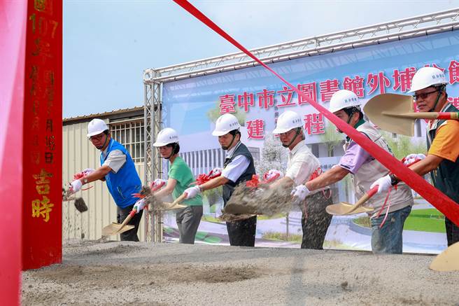 台中市府秘書長黃景茂(左三)在文化局長王志誠(右三)陪同下舉行動土典禮。(陳淑娥攝)距今25年歷史的台中市立圖書館外埔分館將進行大變身!市府編列5500萬元經費將面積擴建4倍至2276平方公尺,原僅30席閱覽座位大幅提升至168席,並採分齡分眾方式規劃,16日舉行動土典禮,預計2020年完工,將讓民眾有更優質的閱讀空間。