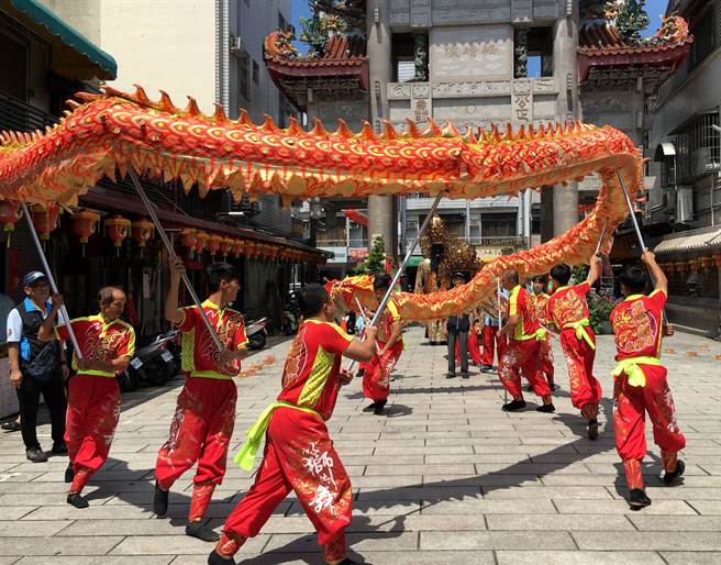 澎湖馬公城隍廟「龍鼓陣」來嘉邑城隍廟舞龍,祈求國泰民安。(廖素慧攝)嘉義市嘉邑城隍廟、澎湖縣馬公城隍廟18日在嘉義市締盟,串起台灣與澎湖的「山海戀」觀光之路,澎湖國家風景區管理處長陳志賢認為,阿里山是國際名勝,澎湖擁有世界級的美麗海灣,布袋港航運正好搭起兩地的山海遊程。