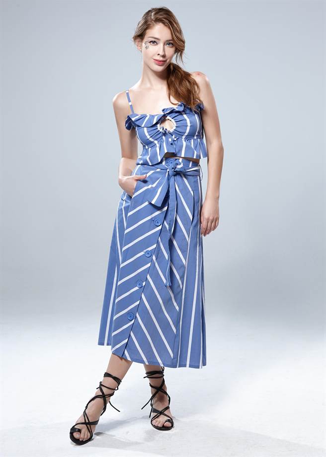 安妮穿上Maje洋裝,搭配迪奧星星妝容展現美麗風範。Maje條紋設計細肩帶背心5340元,條紋設計綁帶長裙8120元,綁帶低跟羅馬涼鞋1萬1360元。(JOJ PHOTO攝)