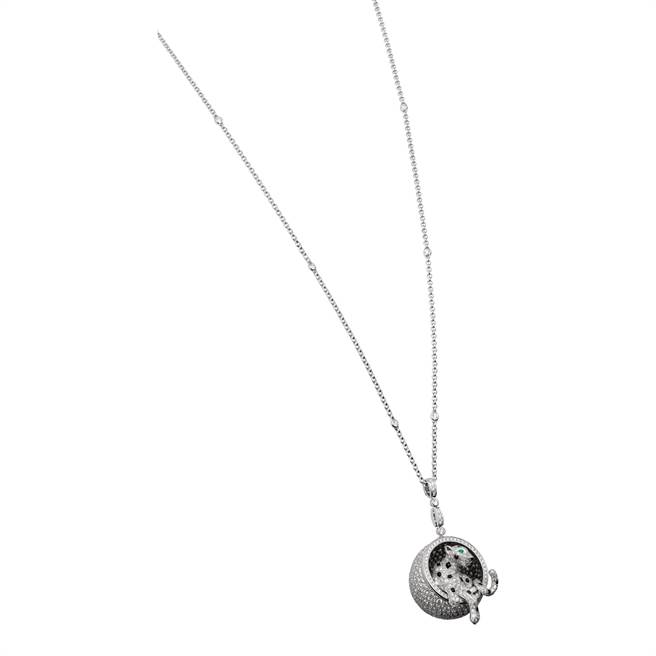 卡地亞Panthere de Cartier美洲豹鑽石項鍊,縞瑪瑙豹紋斑點,祖母綠豹眼。530萬元。(Cartier提供)