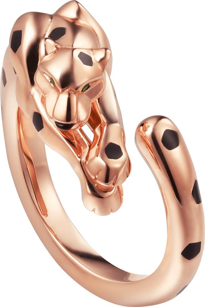 卡地亞Panthere Lovee《纏繞的豹》玫瑰金戒指,鑲嵌2顆沙弗萊石。23萬3000元。(Cartier提供)1914年,卡地亞的經典美洲豹首度面世,以美麗的斑點、優雅的身形和迷人多變的特質,贏得世人的喜愛。百年後的今日,卡地亞推出「Panthere de Cartier」美洲豹系列作品,將美洲豹「陽剛vs.柔美」、「高貴vs.狂野」的萬種風情,融入珠寶與腕表設計當中,預計8月29日正式登台。