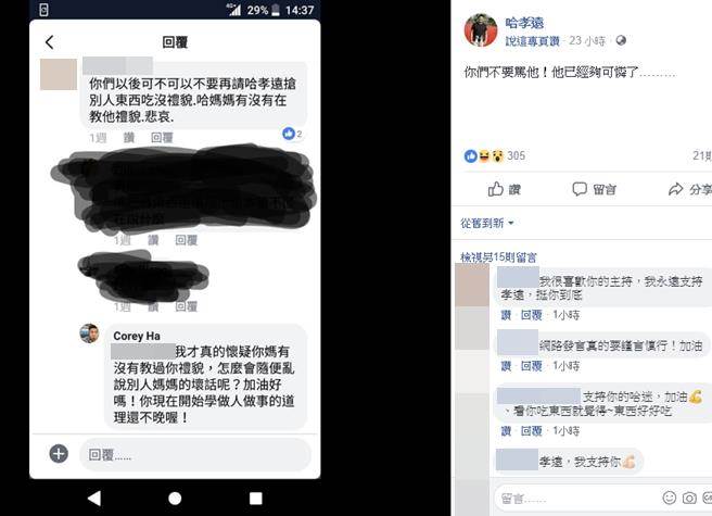 哈孝遠分享回應網友留言。(圖/取自哈孝遠臉書)《食尚玩家》今(28日)爆出4名主持人因播出時間延後為了合約告假風波,昨主持群之一的哈孝遠也自曝遭網友惡意攻擊,對方因踩到他底線,問他:「哈媽媽有沒有在教他禮貌」,使他氣炸用私人臉書回嗆,不久又在公開臉書反酸:「你們不要罵他!他已經夠可憐了………」。