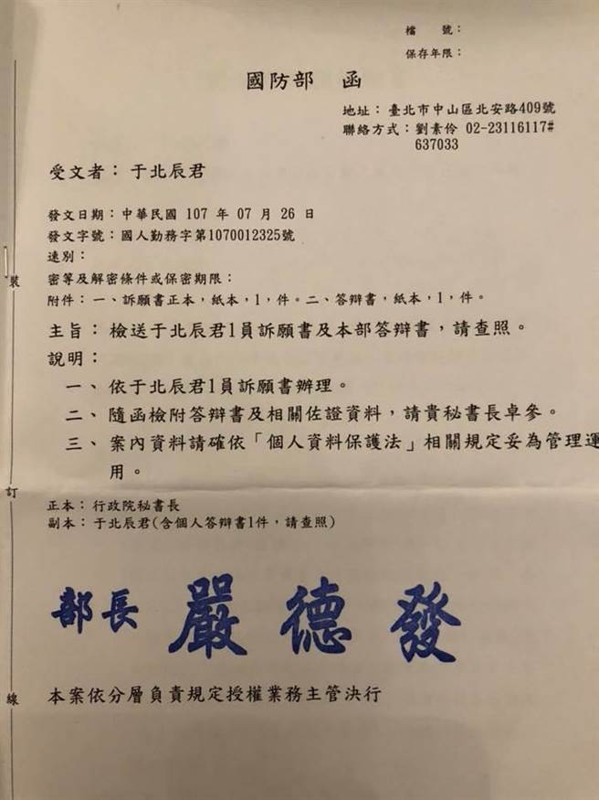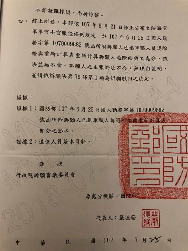 國防部針對軍人年改訴願的回函公文。(翻攝自于北辰臉書)