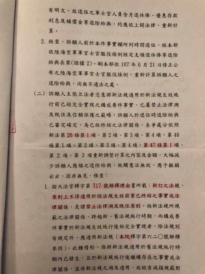 于北辰痛批國防部,是他們協助]蔡英文搶奪了這些退休軍人的財產,他還標註螢光線的部份,怎麼不站在他們的立場解釋,「法律生效前業已終結的事實…」是謂禁止法律溯及既往原則!他們早在今年6月21日前就開始領退休俸了,怎麼不套用啊?