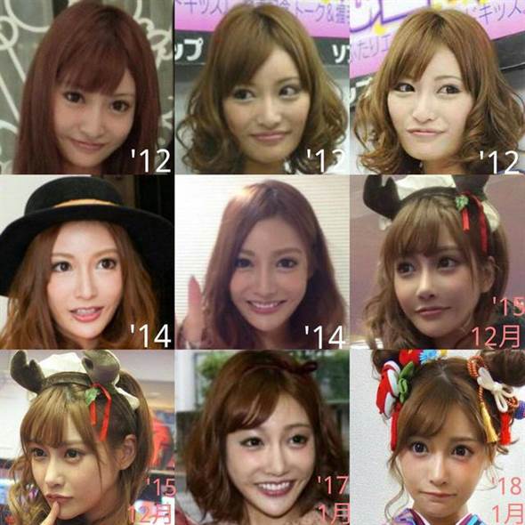 明日花綺羅進化史。(取自日網)擁有H奶火辣身材的日本AV界女神明日花綺羅(明日花キララ),自出道以來整形傳言纏身,近日更有一張號稱她最新近照在日網瘋傳,錐子下巴加上完全不合比例的超級大眼睛讓網友看了直呼好恐怖。