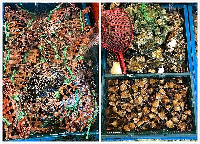 現流萬里蟹(左)、新鮮文蛤與牡蠣(右)。(新北市漁業處提供)漁業處表示,富基魚市是北海岸著有盛名的海鮮魚市,不僅有活跳跳生猛海鮮及在地特色的萬里蟹,各式現流漁獲、龍蝦、鮮魚等應有盡有,秋天是螃蟹漸入盛產的季節,其肉質鮮美,含有豐富蛋白質和微量元素,對身體不僅有滋補作用,吃的時候蘸佐薑醋,還可溫暖腸胃,促進消化吸收,滿足饕客的味蕾享受。