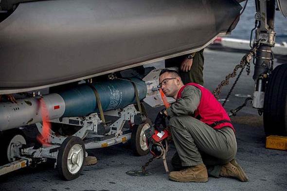 美國海軍公佈的相片顯示,F-35在「胡蜂」號上裝備了導引炸彈。而F-35駕駛在機翼下有武器掛架,加上彈艙內裝備假飛彈的情況下,可以增加模擬實戰經驗。