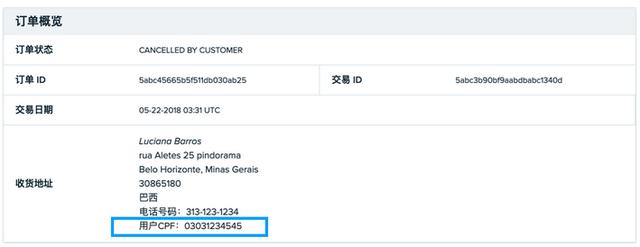 請前往“訂單 > 未處理”或“訂單 > 歷史訂單”,找到並點擊指定的訂單ID,頁面將跳轉至“訂單詳情”。然後在“訂單概述”部分,您可在配送地址底部找到“用戶CPF”:
