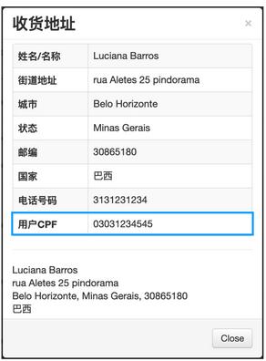 或者您可在“訂單 > 未處理”或“訂單 > 歷史訂單”頁面中,點擊訂單的“配送至 > 查看”,將出現一個“配送位址”模式,您將能夠在該模式的底部查看“使用者CPF”: