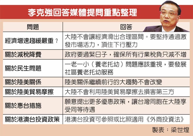 李克強昨日也為港澳台資釋疑,「我在這裡要明確,台港澳投資是可以參照剛通過的《外商投資法》,且長期以來行之有效的制度安排和實際做法要繼續沿用。」
